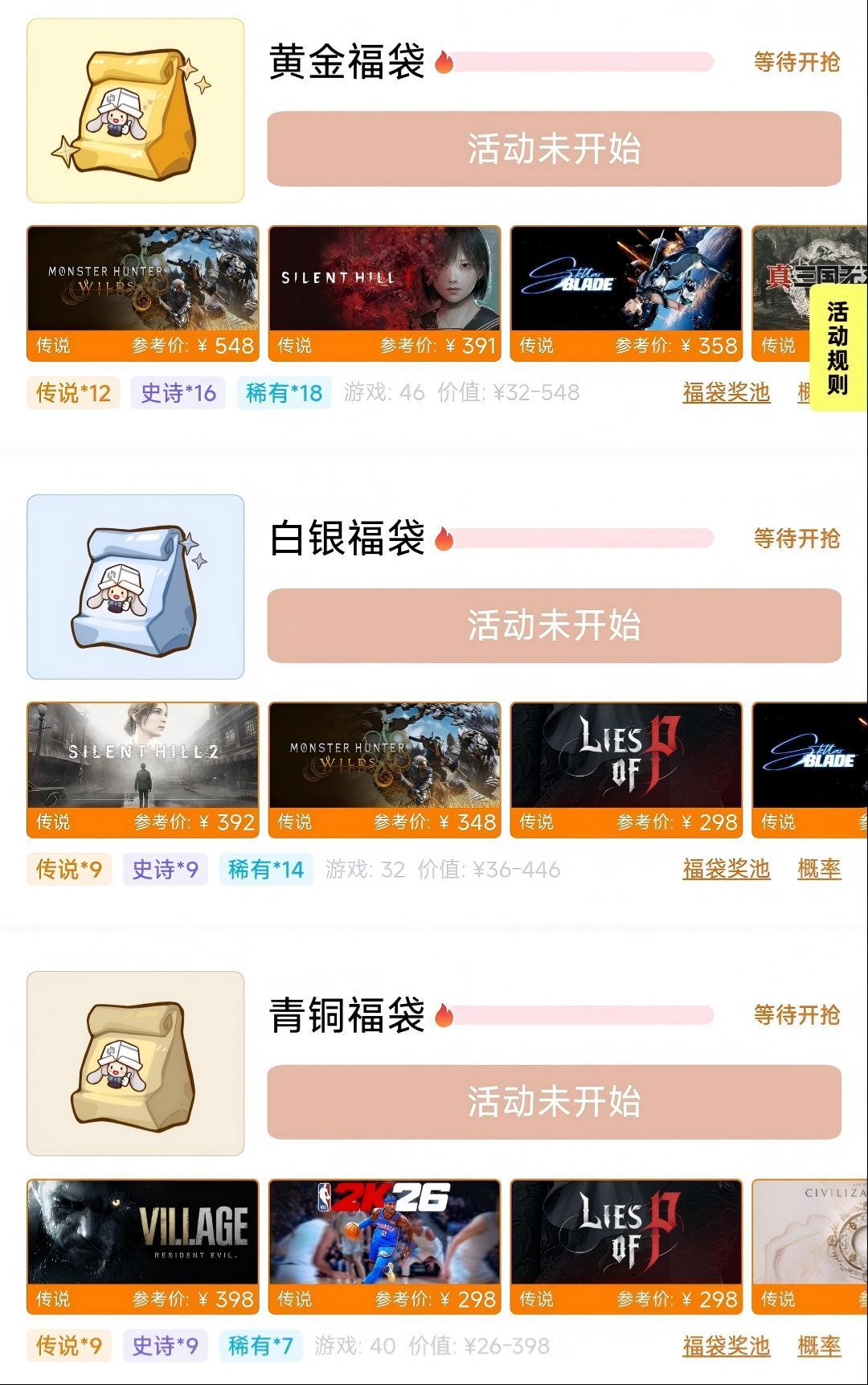 黑盒冬促福袋今晚八点开启!理性消费,谨防受骗 2025-12-19 PC游戏 【活动传送门:点击跳转活动】本次福袋仍然是黄金(29.9),白银(19.9),青铜(9.9)三个档位黄金福袋奖池白银福袋奖池青铜福袋奖池 更多游戏资讯请关注:电玩帮游戏资讯专区 电玩帮图文攻略 www.vgover.com