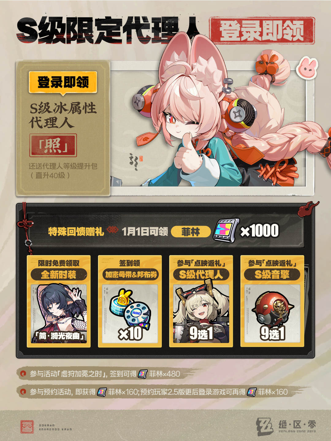 S级冰属性限定代理人「照」限时免费领取,此外还送代理人等级提升包(直升40级)