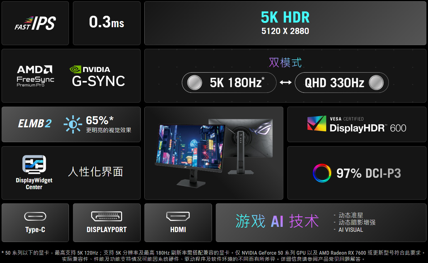 采用了 27 英寸 Fast IPS 面板, 5120 x 2880p 180Hz刷新率(原生165Hz),218PPi。