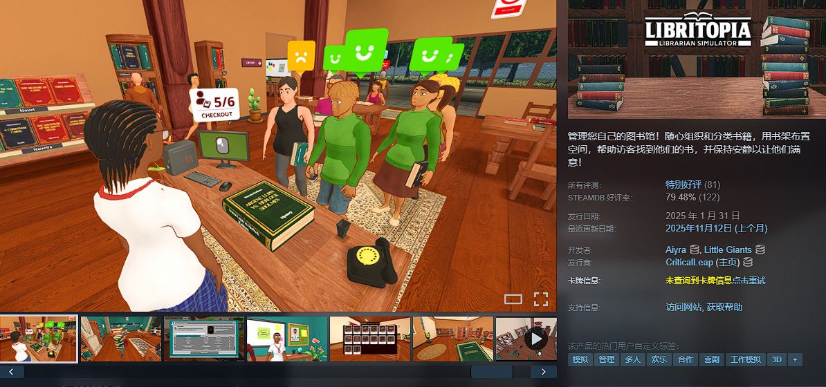管理您自己的图书馆!随心组织和分类书籍,用书架布置空间,帮助访客找到他们的书,并保持安静以让他们满意!