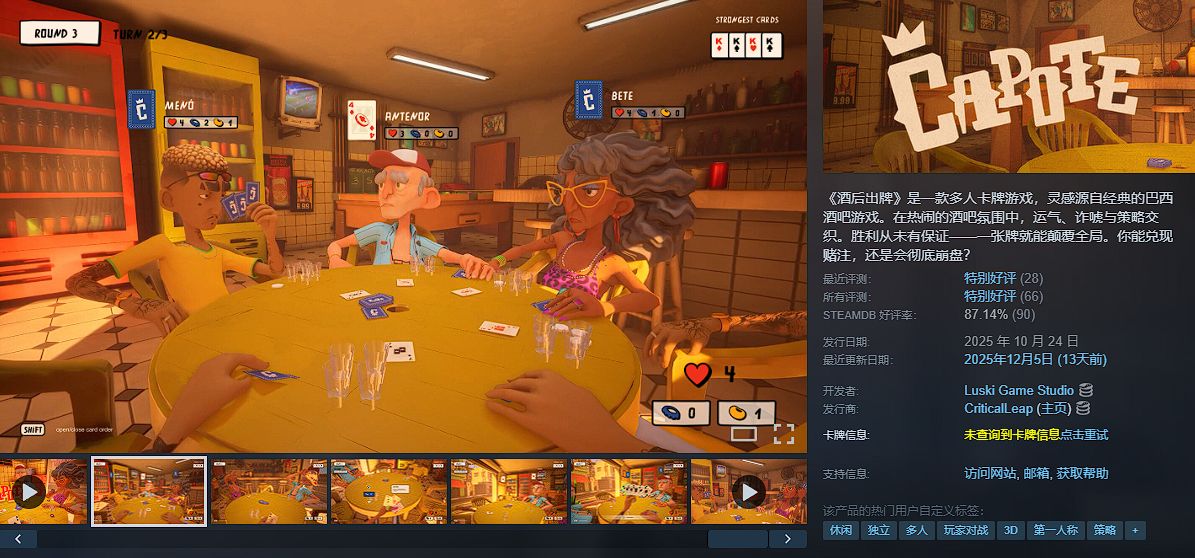 一款融合策略、运气与社交互动的多人卡牌游戏,灵感源自巴西酒吧文化,主打轻松欢快的对战氛围和刺激的随机性体验。