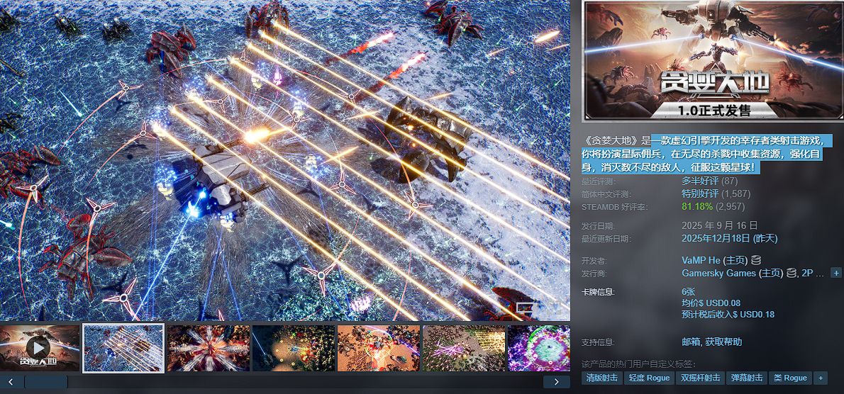 一款虚幻引擎开发的幸存者类射击游戏,你将扮演星际佣兵,在无尽的杀戮中收集资源,强化自身,消灭数不尽的敌人,征服这颗星球!