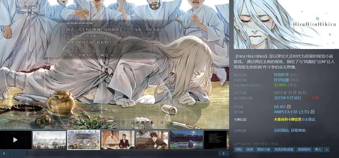 《翩翩夕零》是以架空大正时代为背景的视觉小说游戏。 通过两位主角的视角,描绘了与“风腐症”这种“让人死而复生的疾病”作斗争的众生群像。