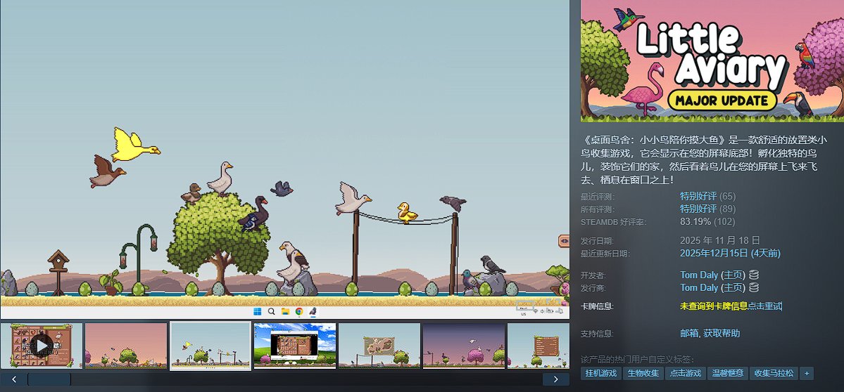 一款舒适的放置类小鸟收集游戏,它会显示在您的屏幕底部!孵化独特的鸟儿,装饰它们的家,然后看着鸟儿在您的屏幕上飞来飞去、栖息在窗口之上!