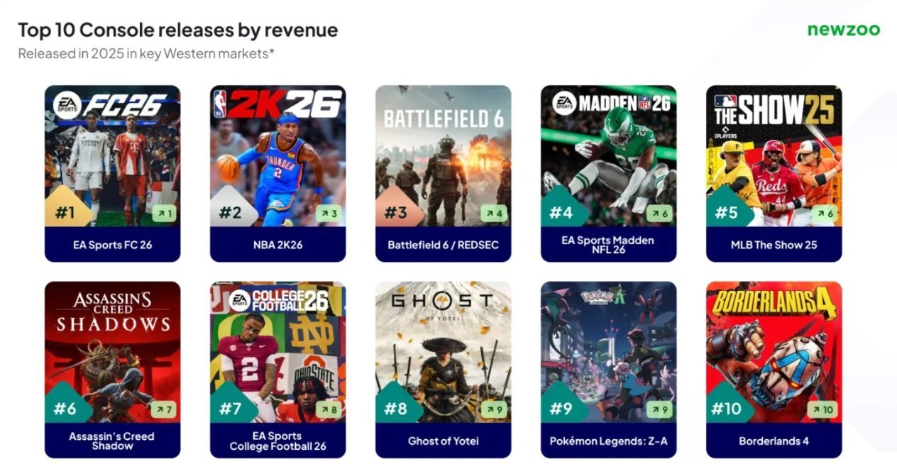 据市场研究机构Newzoo的最新报告,2025年主机平台十大最畅销游戏(按收入排名)正式揭晓。育碧推出的《刺客信条:影》成功入围并位列第六,成为榜单中除体育和射击类游戏外最畅销的作品。