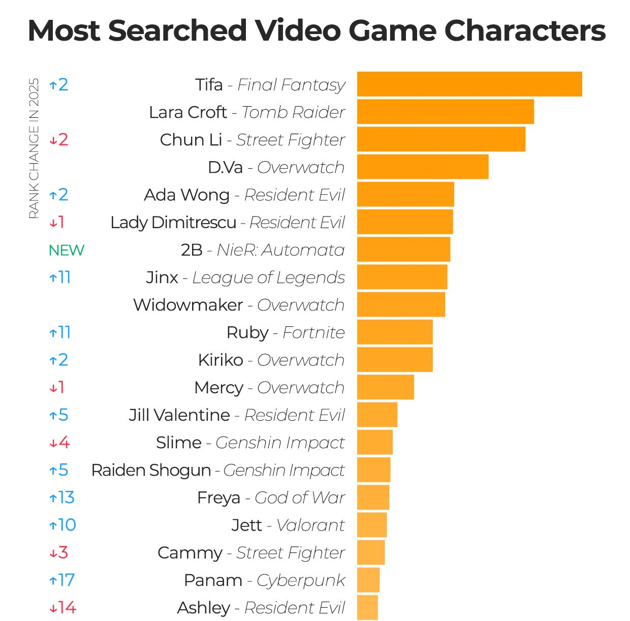 从最开始的蓝色抹胸装到现在蓝色小吊带配白色内衬,吉尔越来越平虽然老是受玩家们调侃,但这么一个意志坚强且从《生化危机1》到《生化危机:启示录2》陪伴玩家多年的女主角,该有的支持还是有的,排名相较于2024年,上升了5个名次,排在第13名。