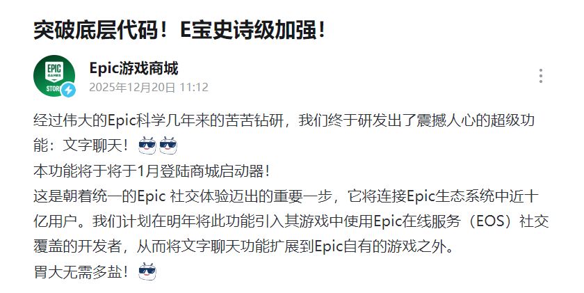 Epic官方宣布,经过团队苦心钻研,终于研发出了超级功能“文字聊天”!