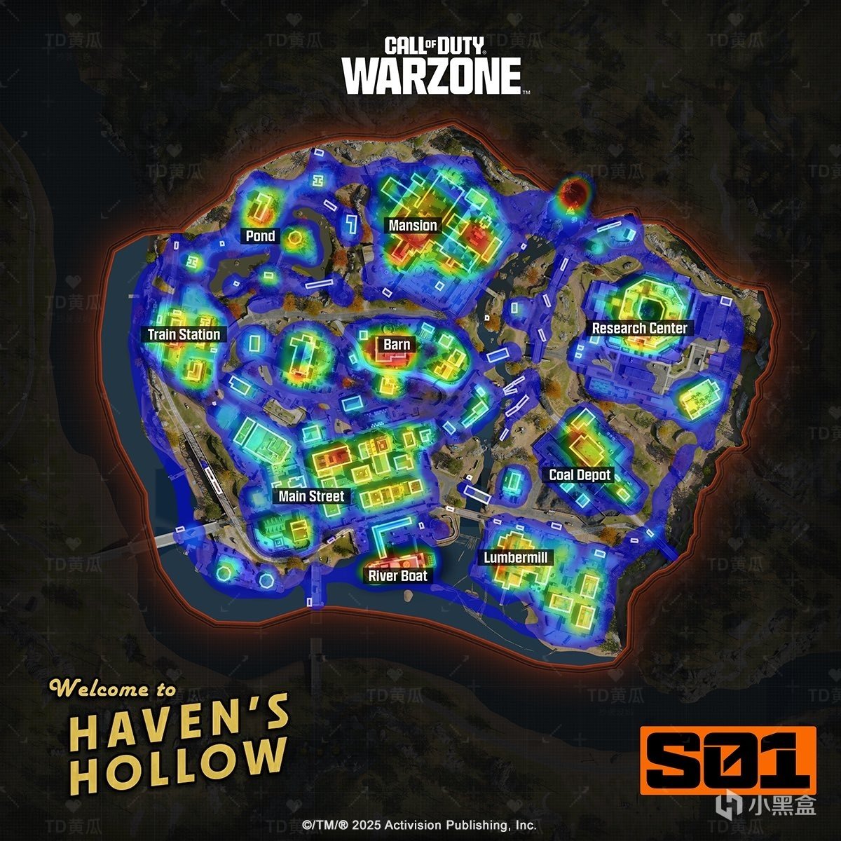 官方發佈了“避風谷”地圖的跳傘熱點圖,其中人數最多的位置是豪宅、穀倉和河船。