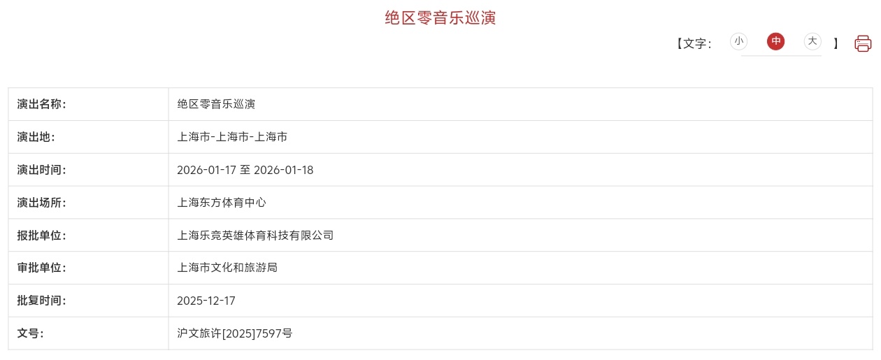 背景:此次巡演是《絕區零》首次以“巡演”形式開展的線下音樂演出,也是繼2025年5月上海UF遊戲音樂嘉年華後,第二次在上海落地的大型線下音樂活動,審批信息的落地意味着官方正式籌備工作已進入實質階段,後續大概率會通過米遊社等渠道官宣具體演出細節(如曲目、票務、嘉賓等)。