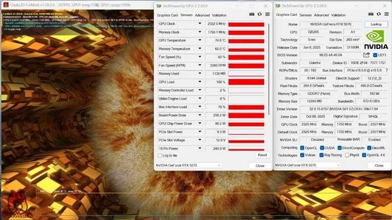 Furmark的参数设定为1920*1080分辨率、0AA。运行1小时16分钟之后,iGame RTX 5070 Mini OC的温度稳定在74.6度,功耗250W,风扇转速3393RPM。