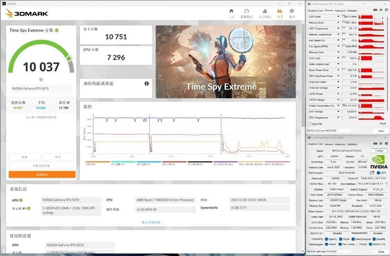 在4K分辨率3DMark Time Spy Extreme测试中, iGame RTX 5070 Mini OC图形分数为10751,核心温度最高76℃,核心运行最高频率为2947MHz,最高功耗252W。