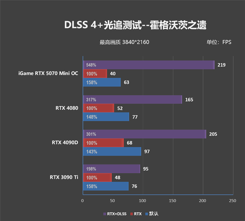 4K分辨率最高画质,iGame RTX 5070 Mini OC的帧率是63FPS,开启光追之后帧率为40FPS,打开DLSS 4,帧率219FPS,提升幅度为448%。