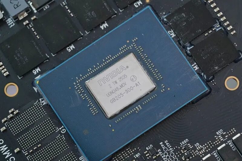 GPU旁边是6颗三星GDDR7显存,单颗2GB,总容量12GB,等效频率28GHz,带宽672GB/s。