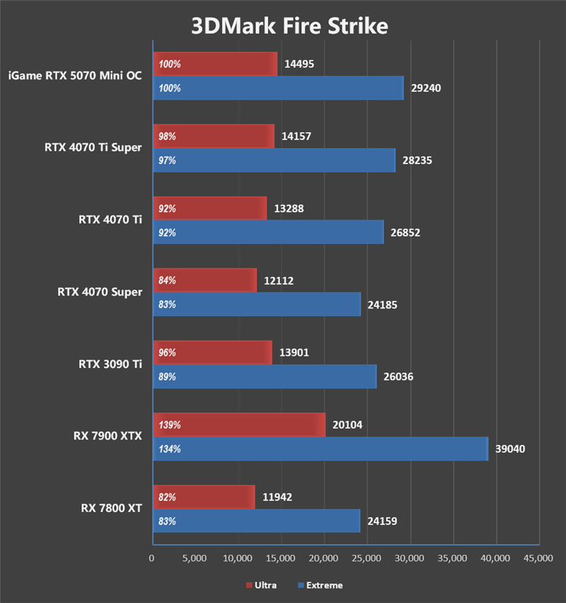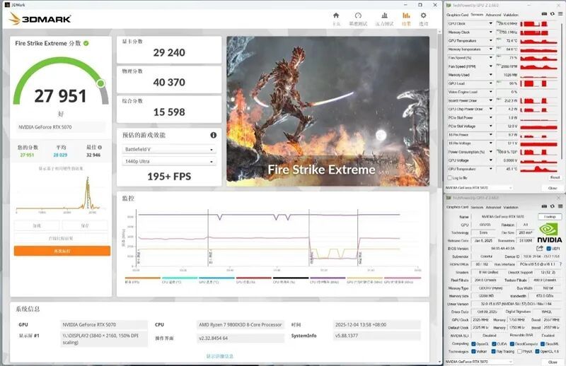 2K分辨率3DMark Fire Strike Extreme测试中,iGame RTX 5070 Mini OC图形分数达到了29240分,核心温度最高72℃,核心运行最高频率为2970MHz,整卡最高功耗252W。