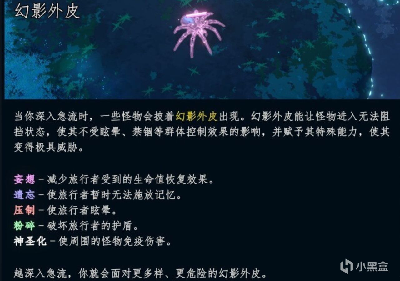 此版本游戏还给敌人更新了一个幻影外皮,通俗来讲就是给敌人身上披了不同的颜色,并且他们会给你带来不一样的debuff。比如我在游戏里遇到外皮红色的敌人时,导致我眩晕暂时不能行动。