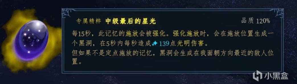 接着玩家被吸进去与夜空之主厄瑞波斯展开战斗,这个战斗的过程boss的攻击会出现黑洞以及交叉的攻击区域,所以也很考验玩家的操作。不过在击败boss后还会掉落一个专属精粹,强化施放会生成一个黑洞。