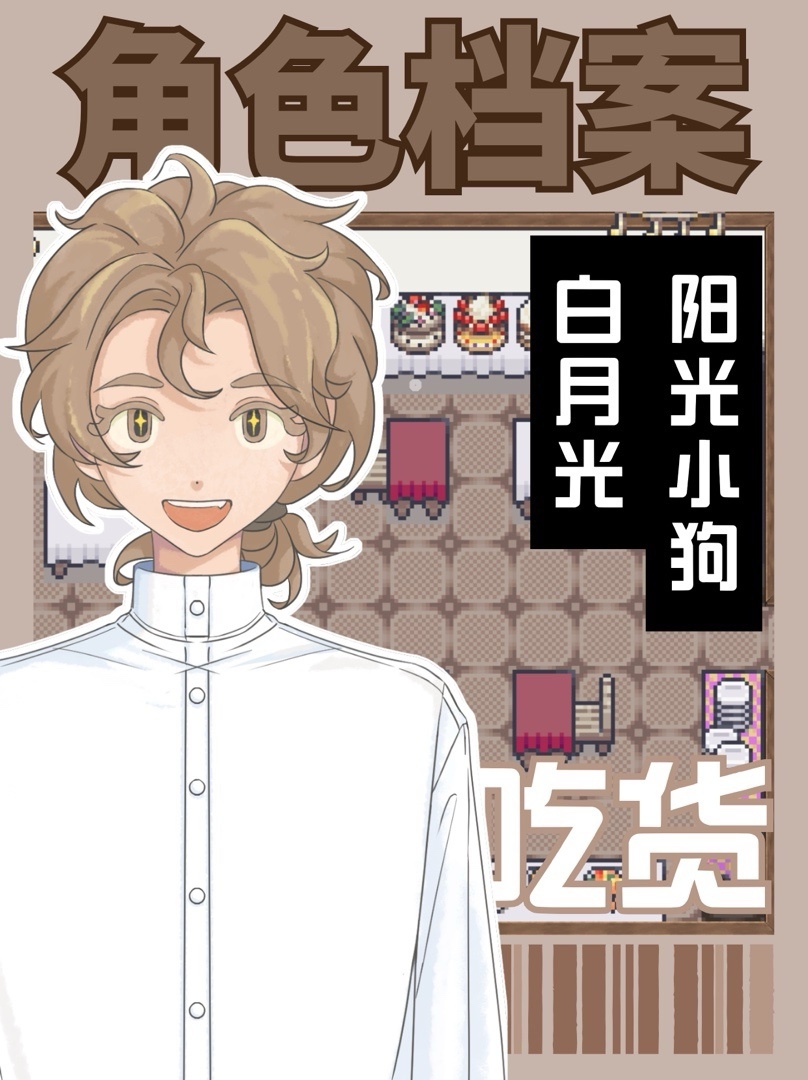 ●发型:区别于主角的黑短直,阿阳是无刘海背头+微卷,脑后还扎了一个小辫子——在像素动效里,它会随着走动一晃一晃,像极了小狗摇晃的尾巴。