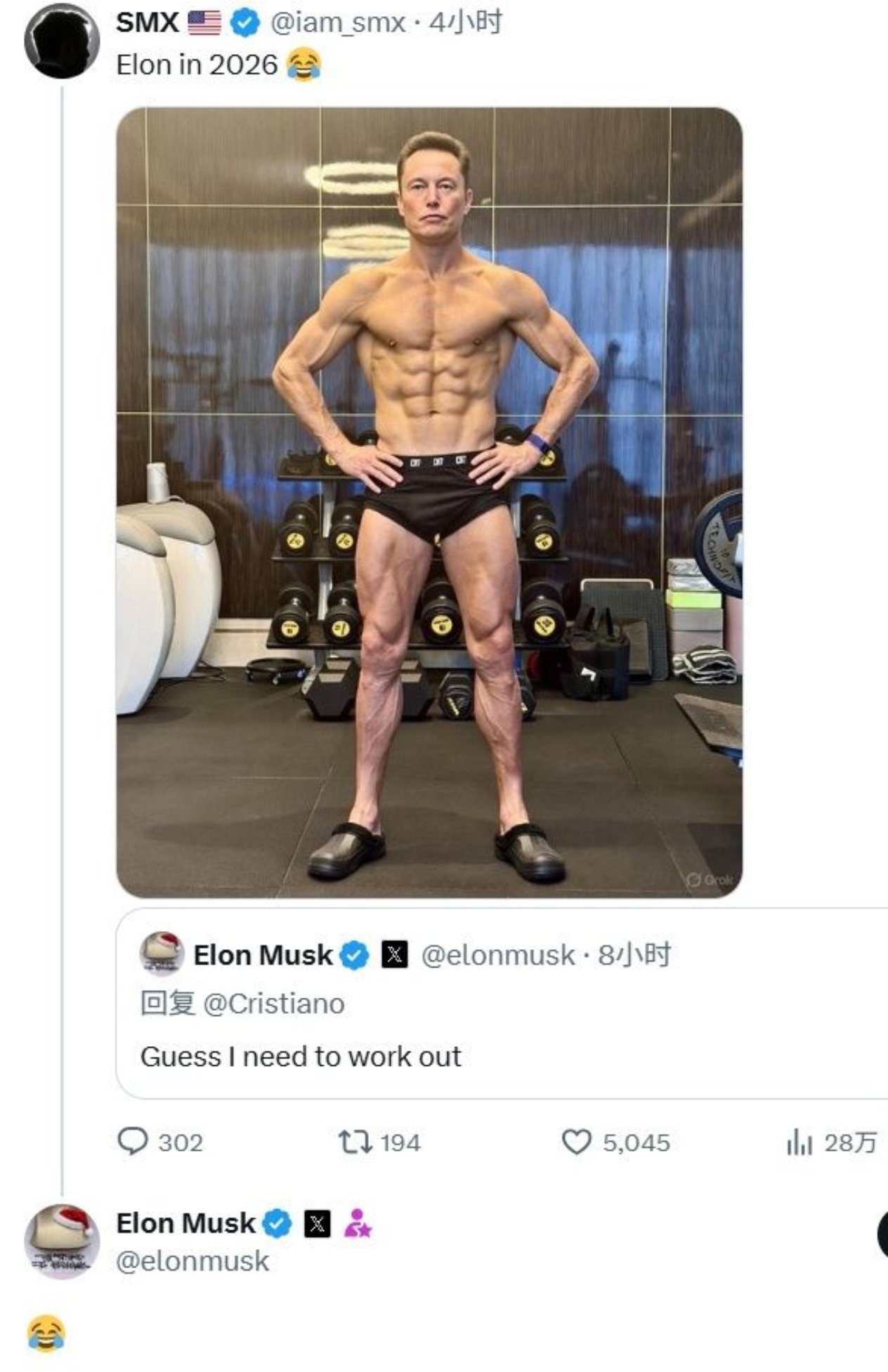 照片中,40岁的C罗肌肉线条分明,身材状态令许多年轻运动员都自叹不如。更引人关注的是,世界首富马斯克现身评论区留言:“我想我需要锻炼一下了”。有创意十足的网友将马斯克的头像P到了C罗的身材上,这一恶搞作品连马斯克本人看到后都忍俊不禁。