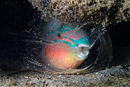 你有见过给自己制作睡袋睡觉的动物吗?没错,就是鹦嘴鱼。它们在睡觉时会选择钻进一个隐蔽的岩石缝里,然后分泌出一种独特的黏液,吐出一个大泡泡把自己地身体包裹起来,只在嘴部留一个小孔。这个“睡袋”能很好地遮蔽气味,防止其他掠食性动物发现自己。