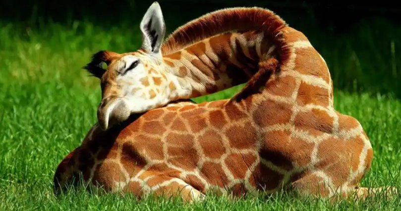 长颈鹿在浅睡眠状态下会站着睡觉,为了减轻脖子的负担,它们有时会选择将脑袋靠在树上睡。深睡眠状态下,长颈鹿会将两条前腿跪下,两条后腿向前一蹦,然后屁股顺势往下一坐,脖子向后弯曲,轻轻倚靠在臀部或后腿上,看来还是个自带枕头的家伙呢。