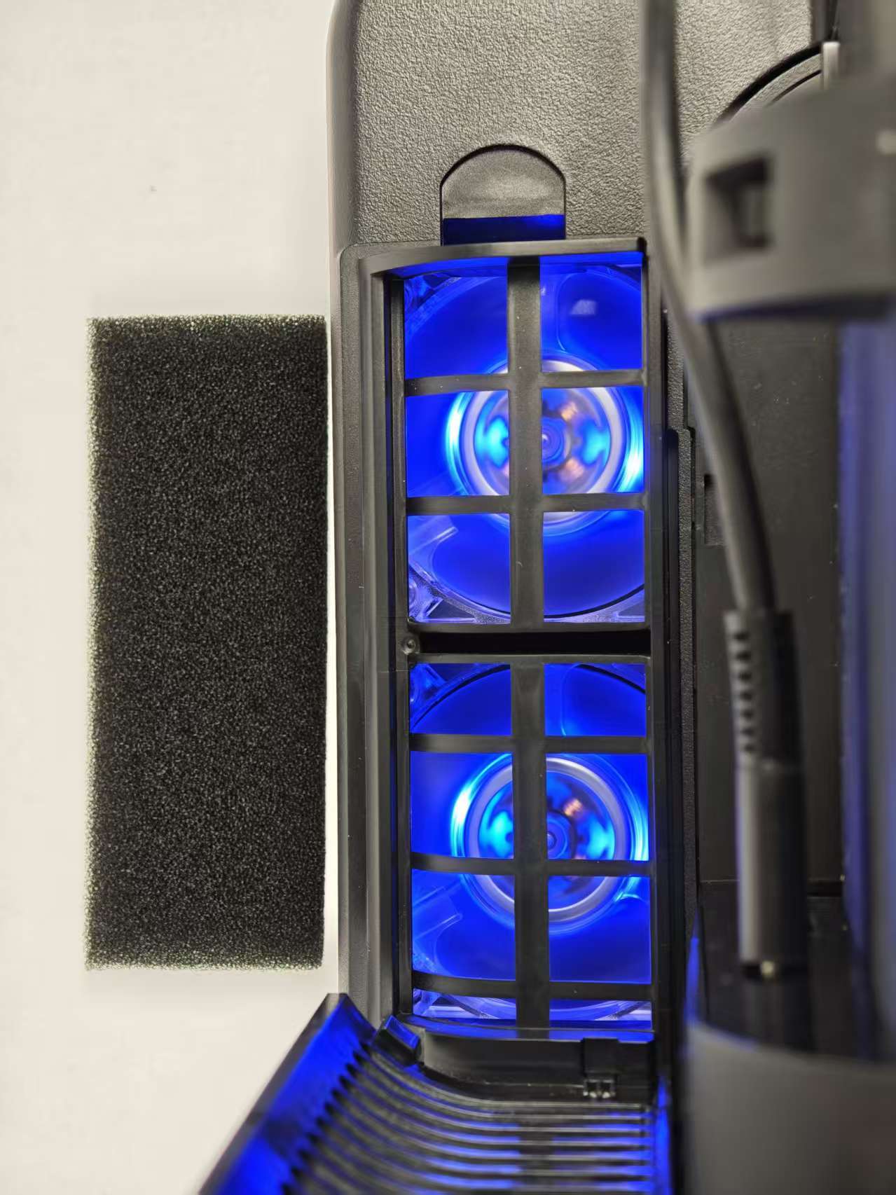 底座的配色材质几乎和官方底座一致,将官方底座放入散热底座二者浑然一体,因此从颜值方面这个底座是不错的,用料很厚实,拿在手里挺有分量;散热风扇工作时后面进风口处会亮起蓝光进行提示,可以看到两个高转速风扇正卖力降温,防尘盖可打开,方便取出防尘棉进行清理。