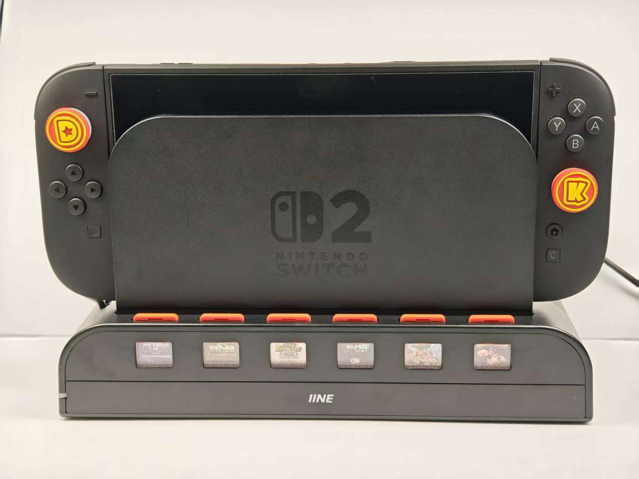 底座的正前方设置了6个卡带槽,方便我们放置平时常玩的卡带,透明材质搭配灯光效果方便查看卡带的同时也为其增加了桌搭属性,通过底座侧面的灯光键可调节灯光的颜色,共七种颜色供我们选择,长按则可以关闭灯光,灯光设置具有记忆功能,会记忆最后设置的灯光设置。