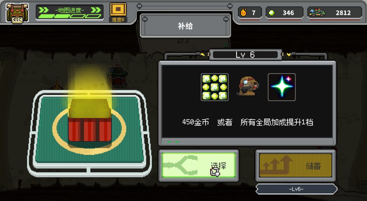 在这里重点说一下“补给”,每个关卡内几乎都有补给的位子,当玩家到达补给位后可以选择直接拿取补给奖励或者选择“储蓄”。如果选择储蓄的话,玩家在下一次的补给位上可以选择更高等级的补给奖励或是再次选择储蓄。当到达6次储蓄后,会给与玩家最高等级的补给奖励:一大堆金币或是一大堆强化点等等。