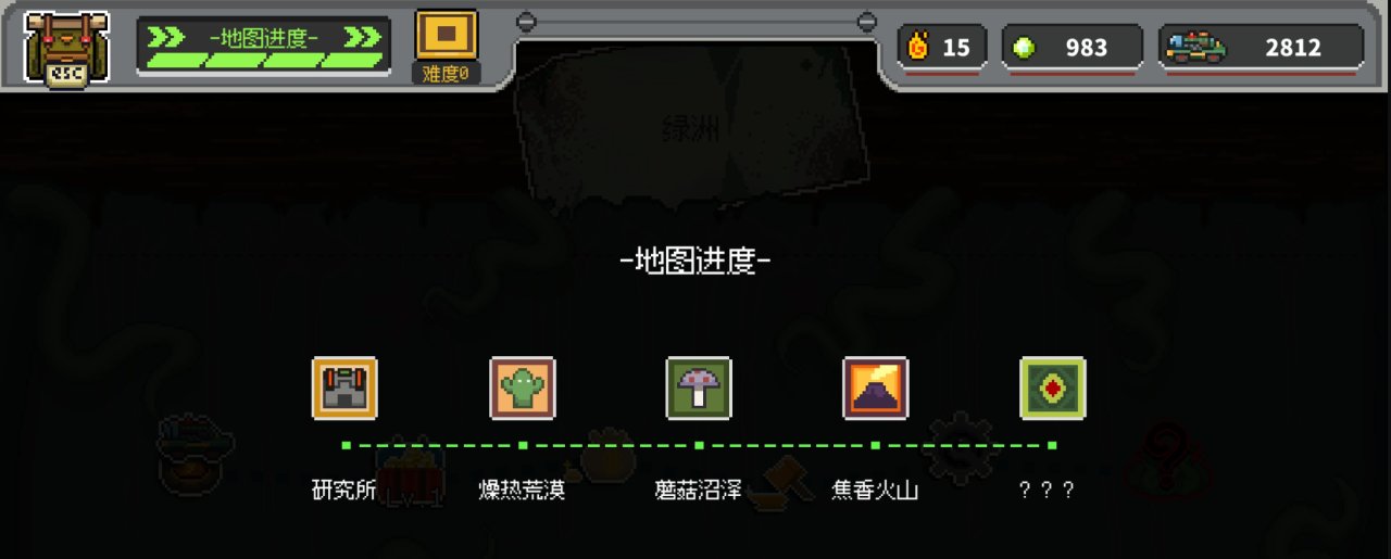 游戏关卡总共分为4大关卡:除了“研究所(初始地点,非关卡)”以外,中间三个关卡随机出现,比如第一个关卡“燥热荒漠”,有时候会替换成“椰汁海滩”等其它关卡。