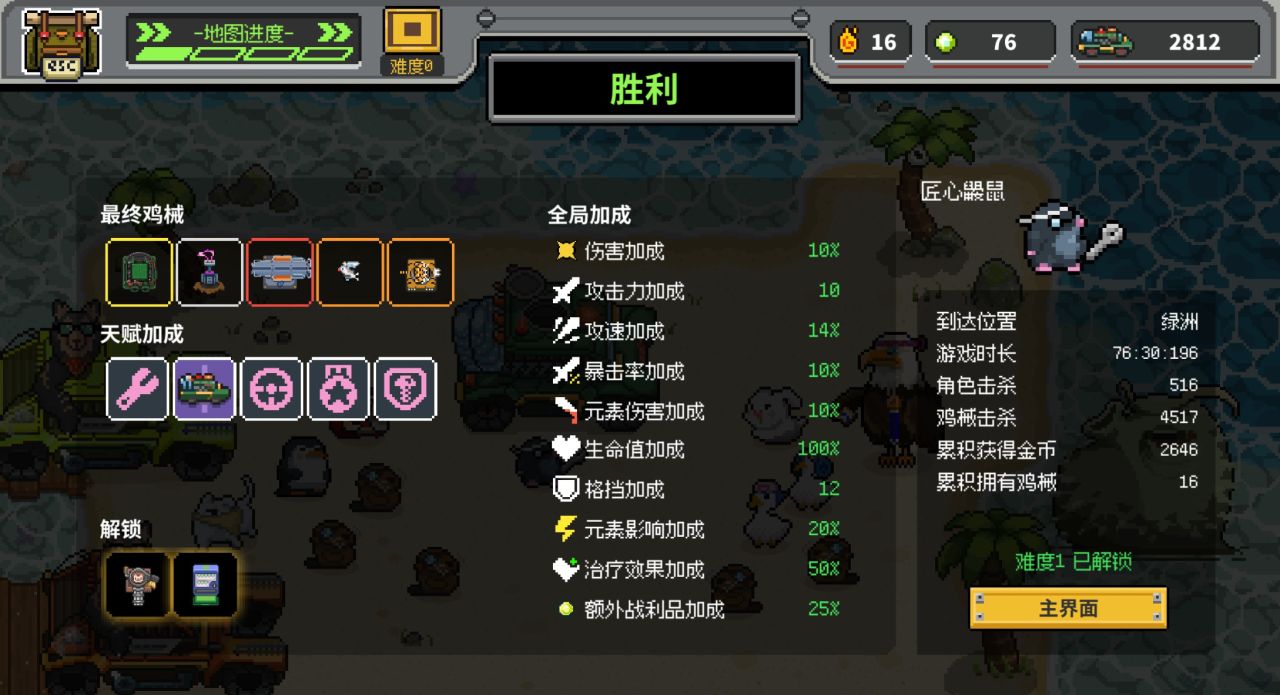 《鸡械绿洲》属于是一款初看不怎么样,一旦上手则立马上头的塔防游戏。游戏不仅有着丰富的策略选择,角色和鸡械的多样性也让每局游戏的体验都大不相同,随机生成的关卡和强化机制也增加了重复可玩性,强烈推荐!