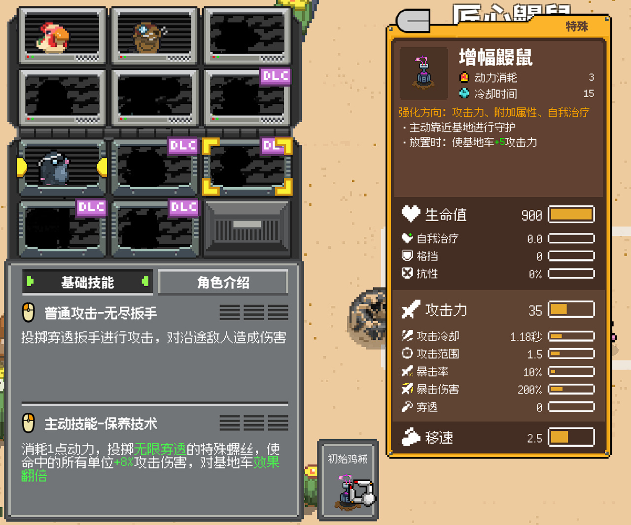 特殊:为范围内的鸡械进行回血、加攻加防等。