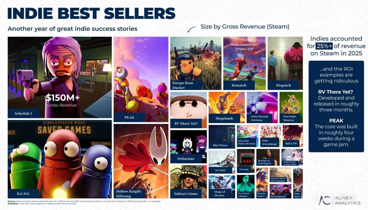 值得注意的是,TGA 热门作品《光与影:33 号远征队》未被归入独立游戏范畴,未计入该数据。头部独立游戏表现亮眼,销量前5的作品合计创收超5亿美元:
