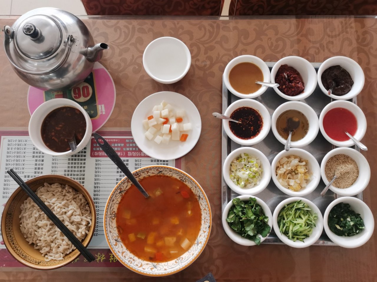 待了一段时间我告别了老板,离开了小院。不断感叹高手在民间。离开卫城后天色不早,我选了一家抿节店解决晚饭。抿节,陕西特色美食,就是把豌豆或小麦面与玉米和高粱等杂粮面粉混合,放入特制的抿节机器里,边压边用手“抿”,最终锅里都是寸余长的小面段,仿佛小鱼一般,称作“节”。煮熟后捞出沥干,吃时配以羊肉汤以及十多碟辅料,非常壮观。口感滑嫩,易于消化。饭吃完了,也该返程了。这次旅行虽然住的不算好,但其他体验尚可。为我之后的西安行做好了演练。