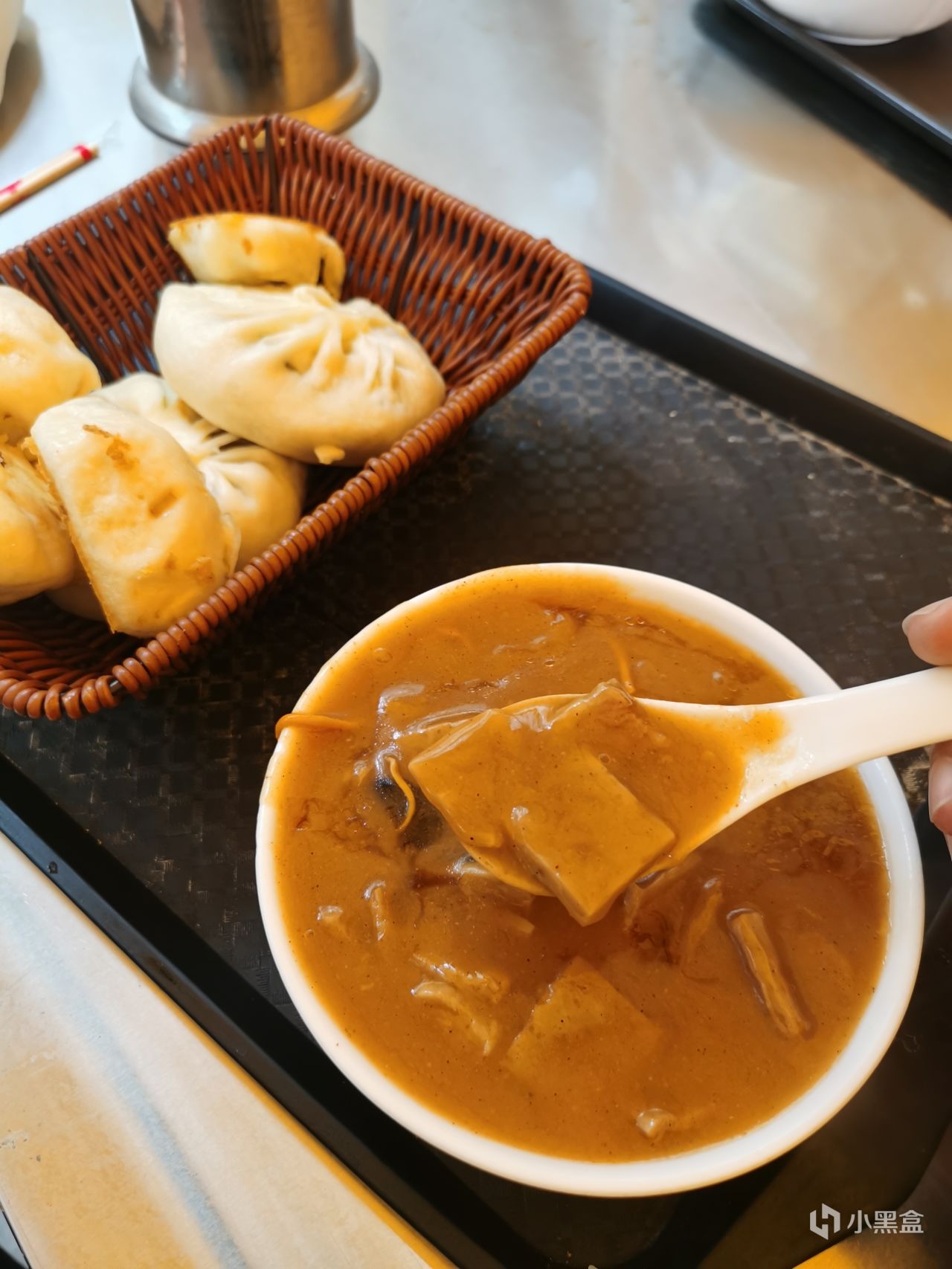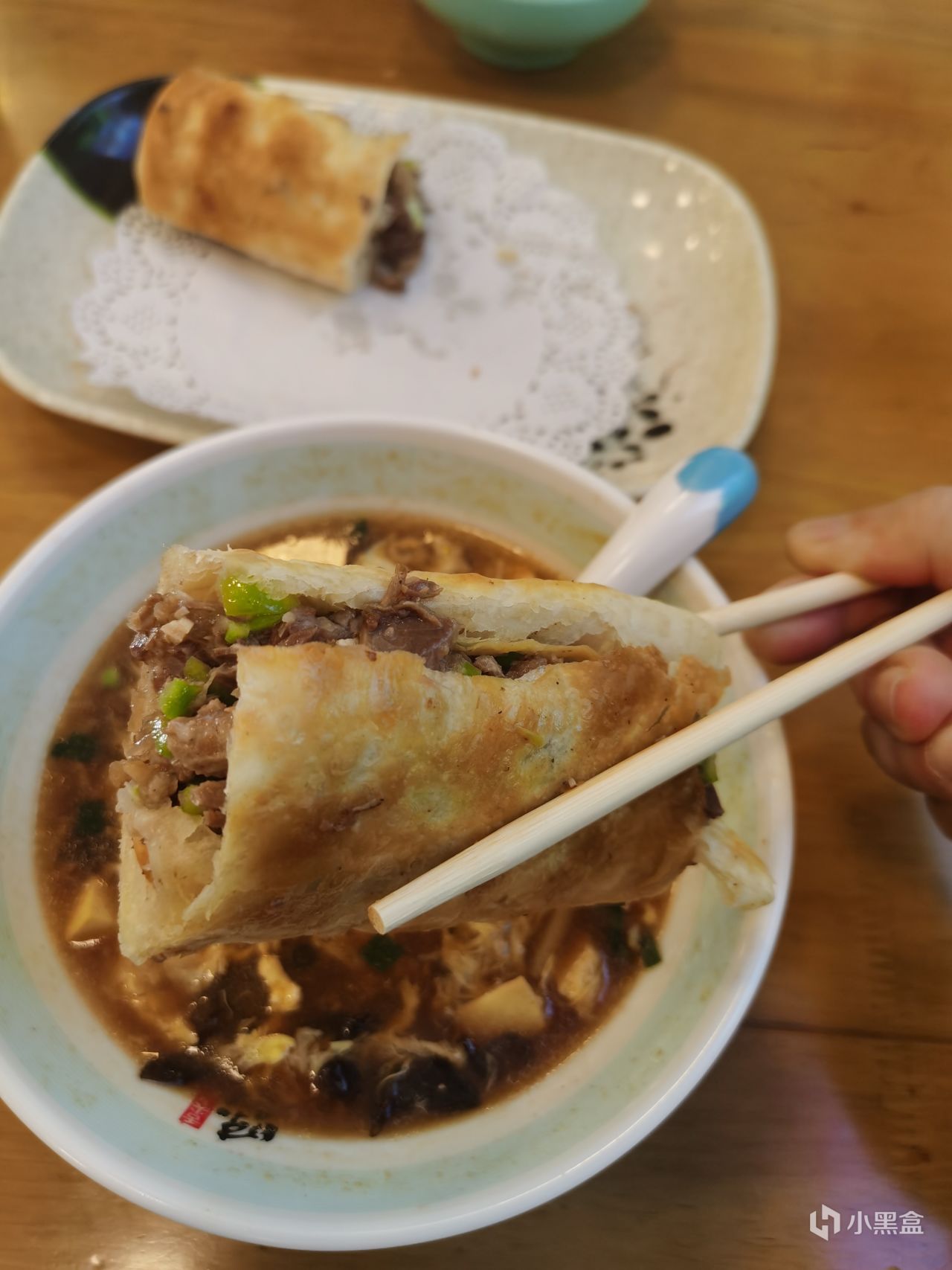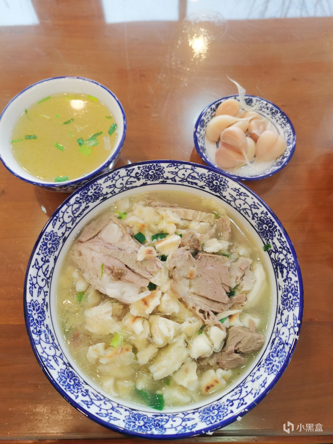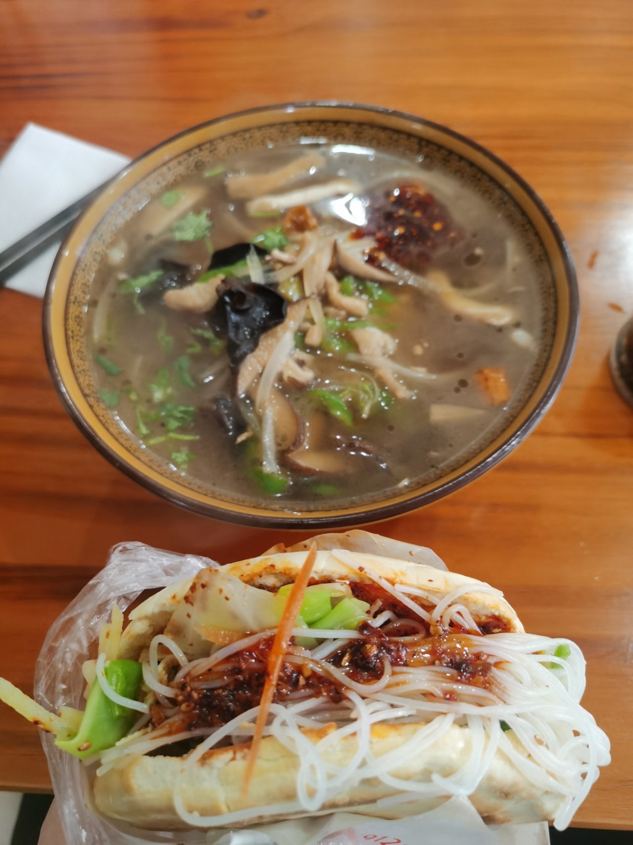 离开兵马俑坑很久心情还是没有平复,看来必须吃一点美食来转换心情了《西安人的歌》中是怎么唱的?西安人不管到哪都不能不吃泡馍。人们说到陕西,如果首先想到肉夹馍,恐怕紧接着就会想到泡馍。西安的泡馍各有特色不分优劣,随便找了一家坐好,因为已过饭点所以店里就我一个客人。老板娘过来啥话没说放下一个饼就走了,我反应了半天才想到这是要我自己掰馍(如果觉得麻烦也可以让老板代劳)。馍是死面做的,掰起来是稍微费点劲的,当我感觉自己已经尽力掰好后把碗交给老板娘,她友善地笑了笑让我再掰小点,至少是小指甲盖那么大,否则不好入味。于是我再次回炉重掰了半天。虽然最终成品也不太合格,但我吃的很香。一口下去鲜美的羊肉汤配上弹牙的粉丝木耳,还有浸满汤汁、软糯可口的馍块都在嘴里释放出自己的滋味。再加上两瓣脆爽的糖蒜,怪不得说泡馍就像人民币,没有人会不喜欢