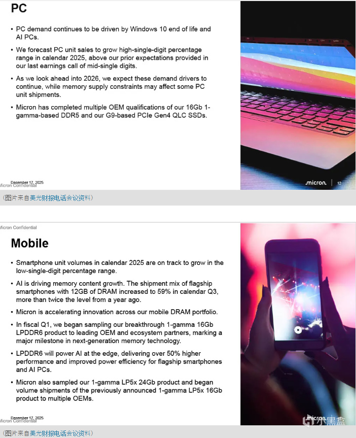 美光计划将2026年资本支出提升至200亿美元,扩建美国及海外工厂,但新产能最早2027年投产,短期难以缓解供需失衡。智能手机和PC领域内存搭载量上升,推动需求持续走强,消费者或将面临更长时间的价格高位运行。