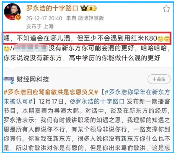 这话之所以引发不满,是因为他写道 “至少不会混到用红米 K80”。这是他 17 日回应网友质疑时说的,当时有网友拿他高中学历调侃,问没有新东方他能混得怎样,他没正面回应,反倒扯出了手机。