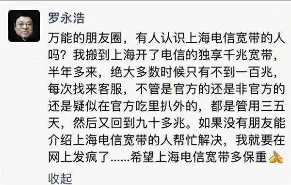 近日羅永浩在朋友圈吐槽上海電信的寬帶,說自己再得不到解決將“在網上發瘋”。原文如下: