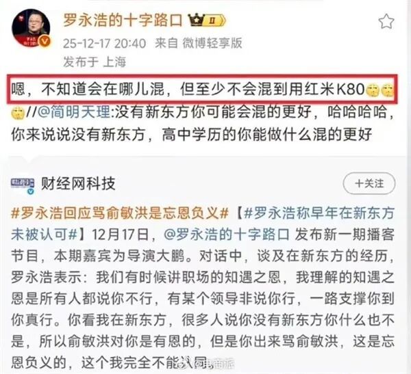 當被吐槽沒有新東方,高中學歷的你能做什麼混的更好的話語時,羅永浩也是本能開啓回懟模式,纔有了“不知道會在哪兒混,但至少不會混到用紅米K80。”。