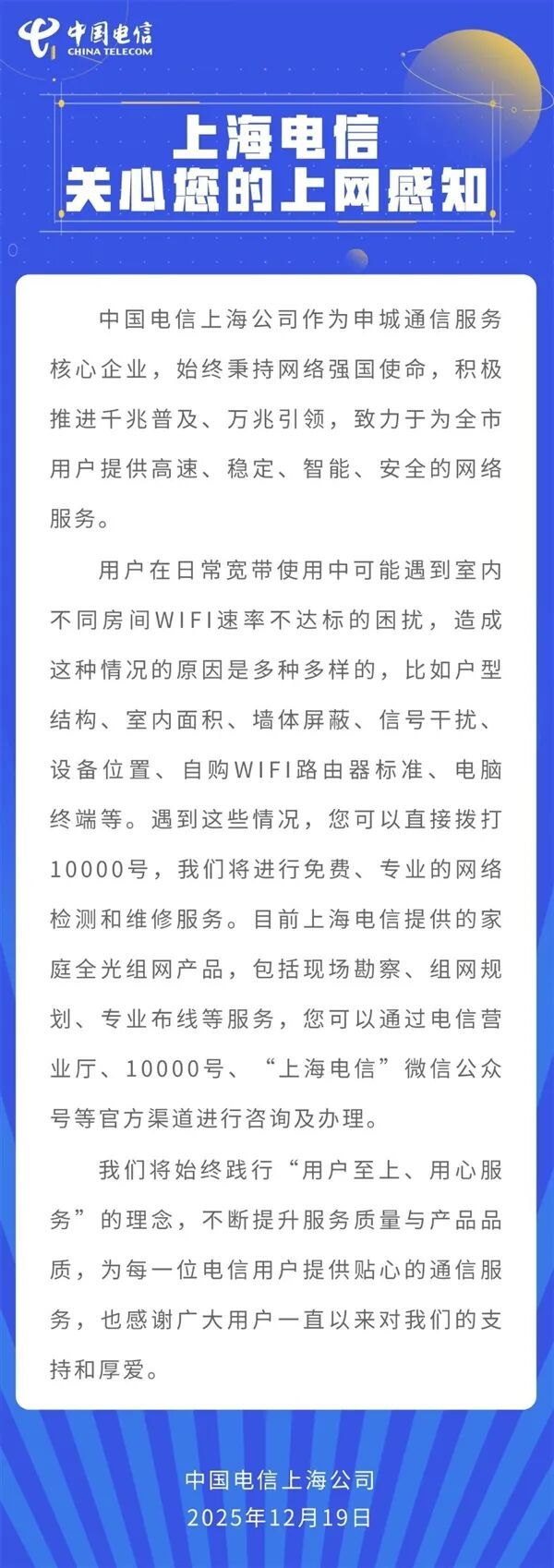 對於這件事上海電信發文稱,用戶在日常寬帶使用中可能遇到室內不同房間WIFI速率不達標的困擾,造成這種情況的原因是多種多樣的。