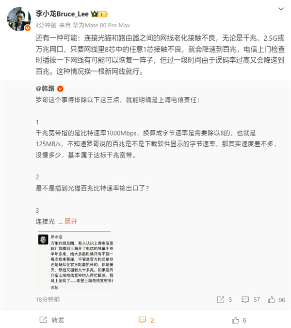 值得一提的是,羅永浩朋友圈在網絡上流傳開後,不少上海電信用戶反映自己也遭遇過類似情況,稱千兆寬帶實際速率未達標。