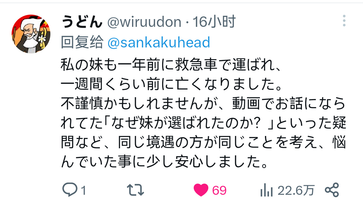 我的妹妹也是一年前被救护车送走,大约一周前去世了。 或许这样说有些冒昧,但在视频中听到您谈到“为什么偏偏是妹妹?”等疑问时, 得知有相同境遇的人也有着同样的想法和烦恼,我稍稍感到了一丝宽慰