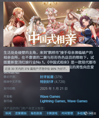 過年的年度最佳了屬於是,本作主打的就算模擬中國式婚戀社交的遊戲,扮演媒人或相親者,在家庭壓力與社會現實中尋找平衡,近期好評率98%。