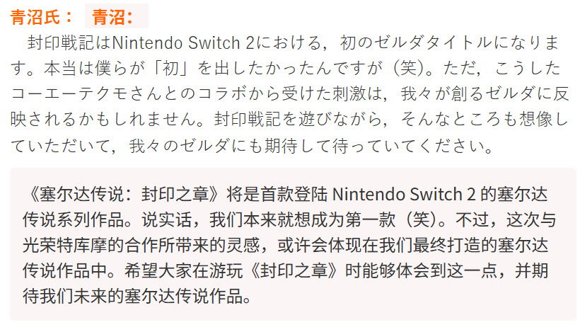《塞爾達傳說》系列製作人青沼英二透露,他原本希望由任天堂本社開發的《塞爾達》作品成爲Switch2首發遊戲,而非光榮特庫摩開發的《塞爾達無雙:封印戰記》。不過他也承認,此次合作確實爲系列下一款遊戲提供了創作靈感。‘’