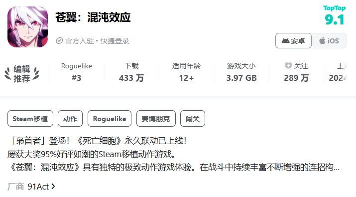 《苍翼:混沌效应》在TapTap有着433万下载