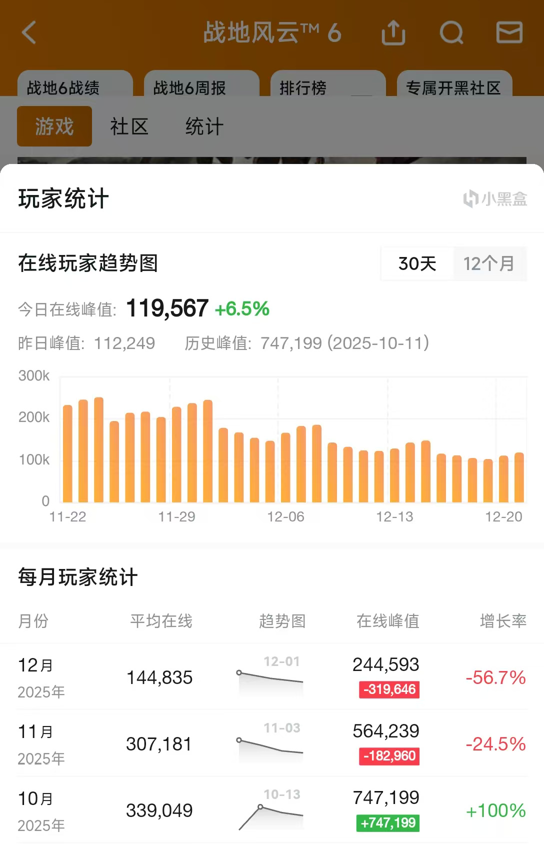 其實在發售前,市場對戰地6的期待空前,一度被譽爲“戰地之年”。其開局也確實火爆,曾創下74.7萬玩家同時在線的紀錄,甚至超越了歷代《使命召喚》。然而,正是如此高的起點,讓隨後玩家數量的急劇下滑顯得更爲突出。