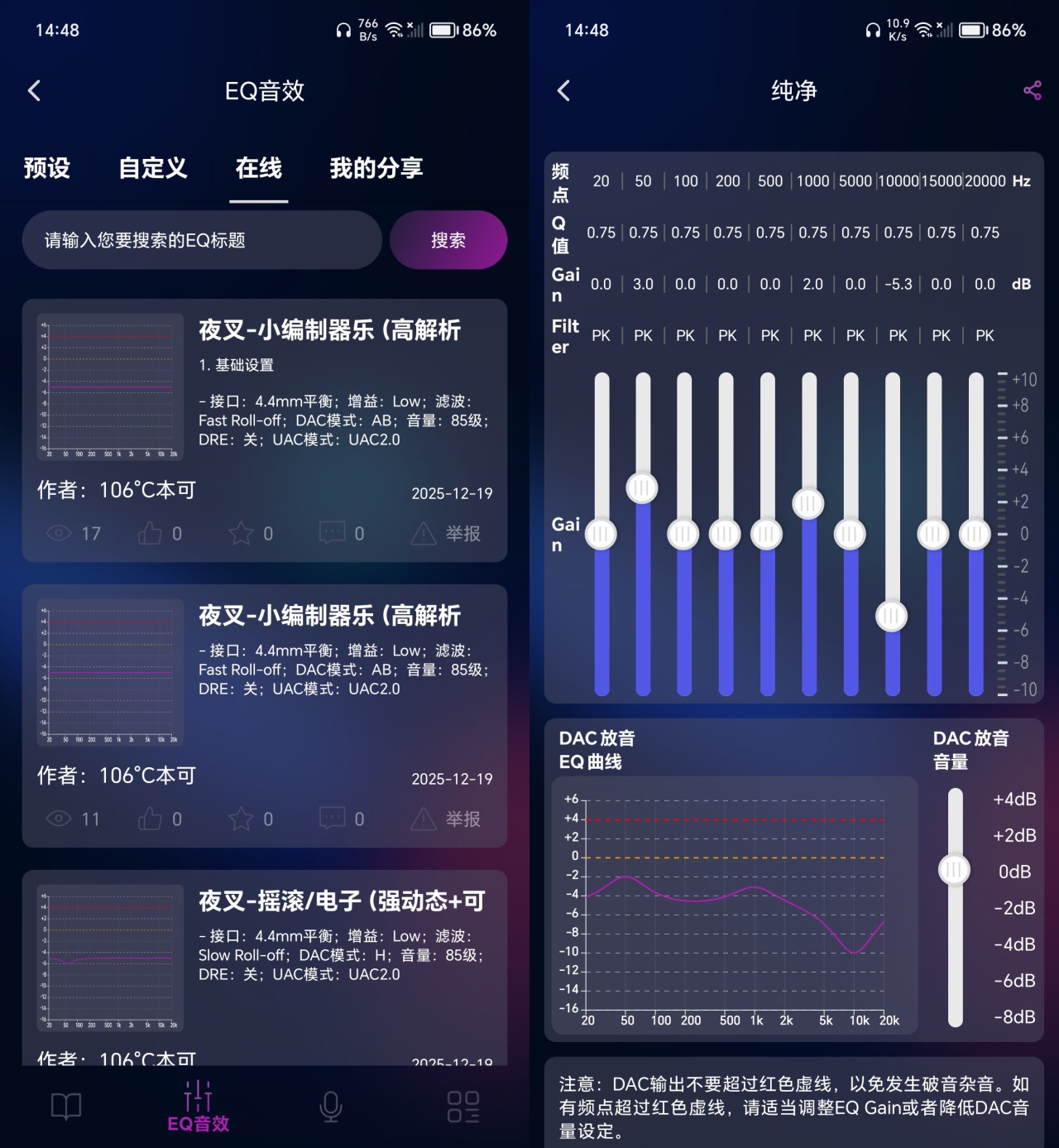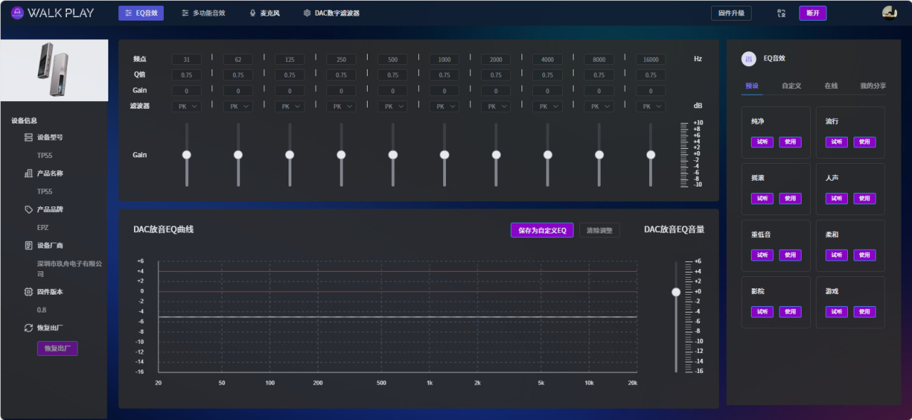 TP55和TP35Pro一样支持APP及网页端调节EQ,有专门的软件Walk Play,软件内也预设了很多EQ方案,有社区玩家会在社区分享自己调的EQ,生态这块做的挺不错的,不过自定义EQ这里TP55较TP35Pro多了两段可调PEQ,调音的精细化程度要更高。