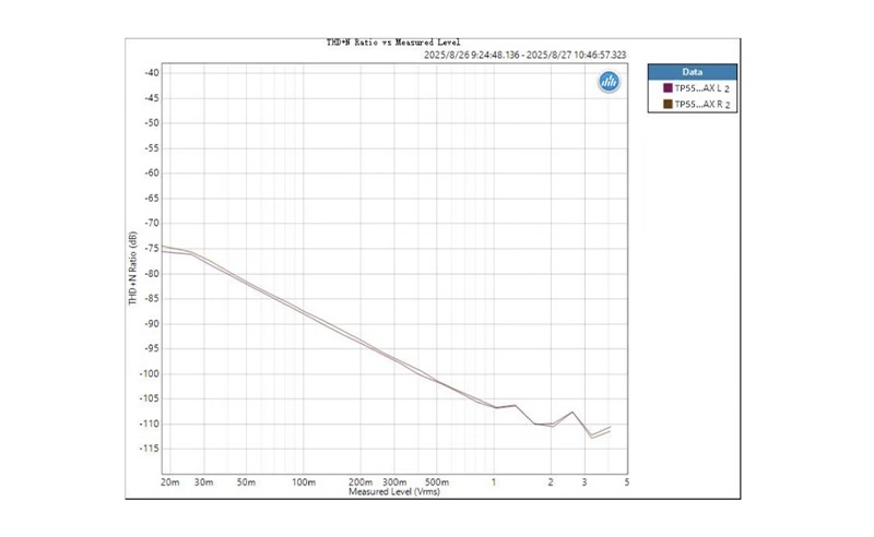TP55较TP35Pro有更低的失真表现与更高的信噪比(TP55:信噪比≥135dB,THD+N 0.00014%;TP35Pro:信噪比≥130dB,THD+N 0.0005%),尤其是失真降低了约72%,让背景更黑,何为更黑?说人话就是整个声场非常纯净,已经接近0底噪了,人耳能听到的只有人声和乐器声。这个听感当你用上TP55,人声出现的一瞬间就能很深刻地感受到。
