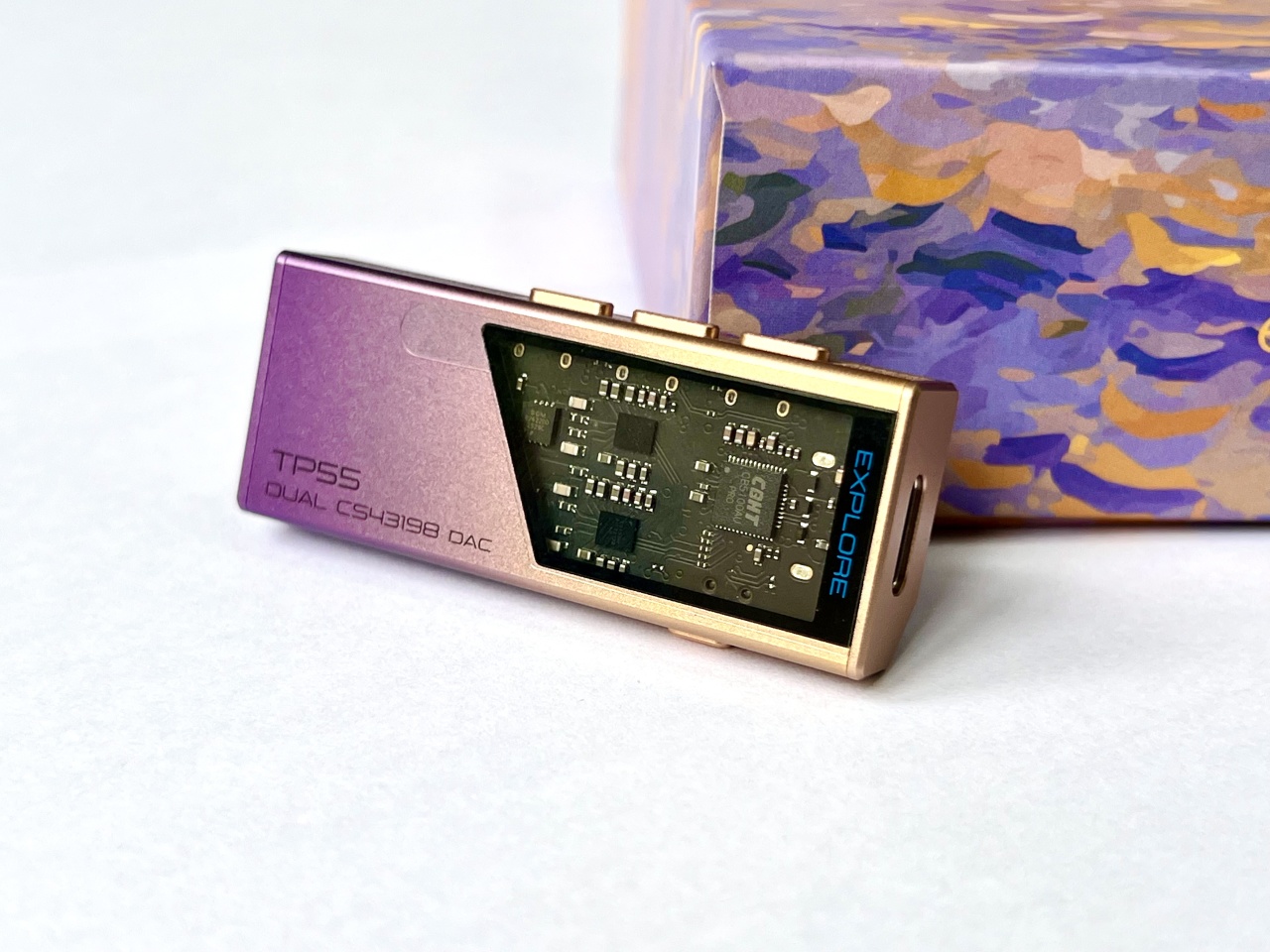 外壳壳体采用航空铝材+CNC一体加工,表面阳极氧化工艺处理配合透明视窗整体质感手感都很不错,通过透明视窗能看到内部的CB5100主控以及双CS43198 DAC芯片和双SGM8262独立运放芯片,透明视窗表面贴了层软膜。