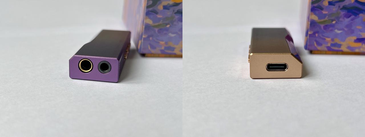 正面和背面印有产品名称、主要参数和配置信息,背面是单独的小透明视窗,工作时会有指示灯亮起,两侧是音量加减键(100级音量调节,比手机调节音量更细腻),暂停键,以及增益切换键(难推的大耳用高增益推,低增益推常规塞子够够的,而且还能抑制底噪),突出一个“麻雀虽小五脏俱全”。