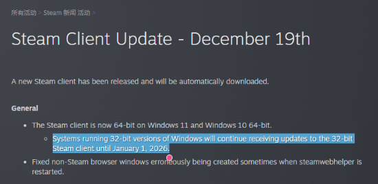 公告关于steam系统的更新中,V社表示,目前32位的Steam客户端将在26年1月1日停止更新。不过,当前64位版Steam不仅支持Windows 11,同时还会继续支持Windows 10。