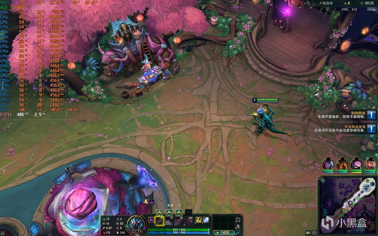 ▼遊戲實測,LOL大亂鬥模式,2K分辨率,全集高畫質,泉水遊戲幀數在406幀左右。